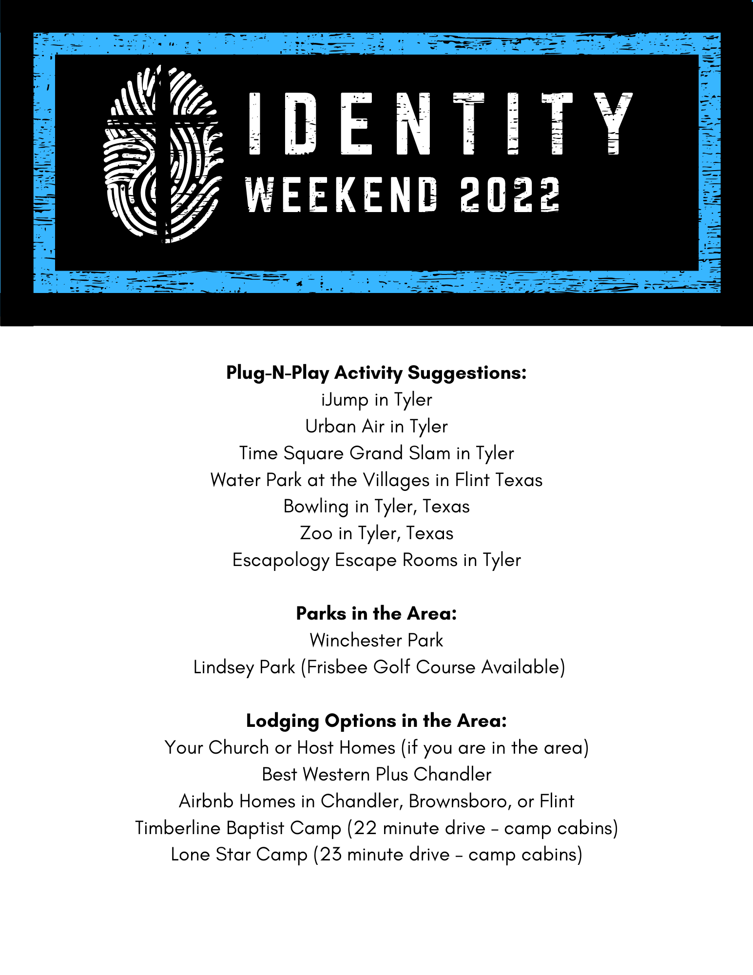 Each church will be responsible for lodging and meals for their students.On Saturday each church will have a church time called Plug-N-Play in which the church schedules a fun activity for their group to participate in. Each session will have a small group component, that is designed to be led by the church group leader with their individual church group. Below is a list of Plug-N-Play Suggestion activities.